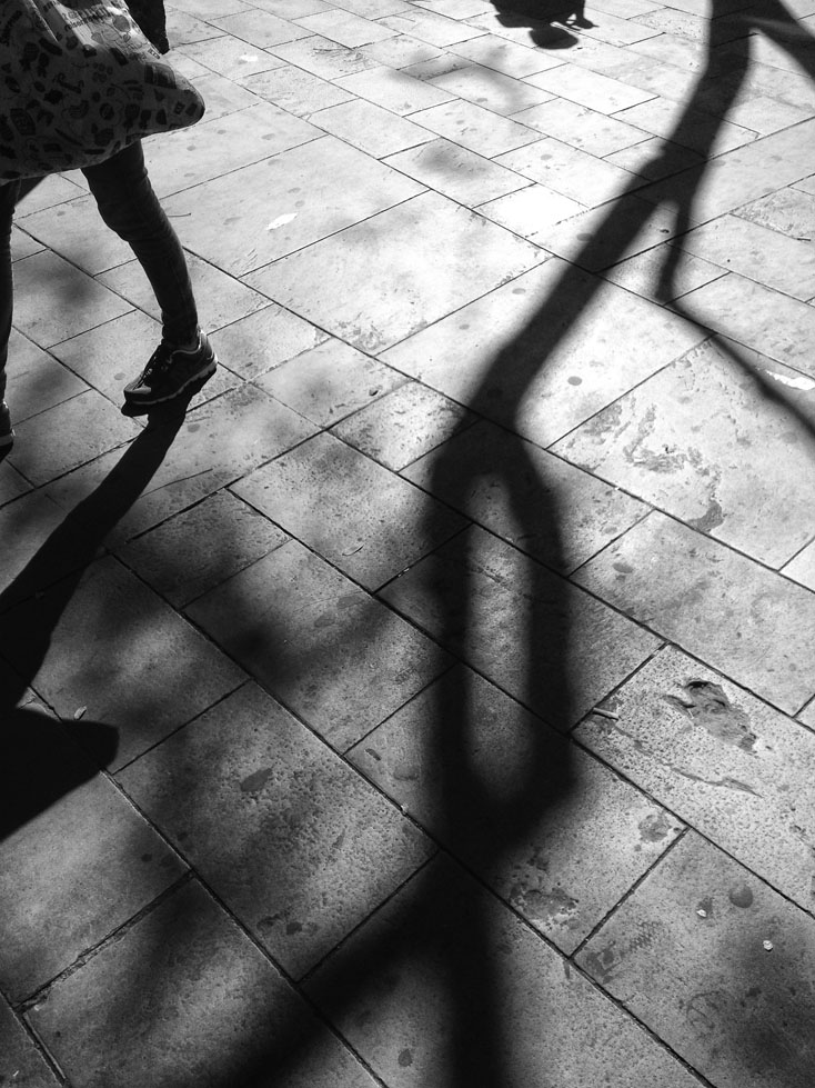 En partant de Santa Maria del Mar, j’emprunte la Carrer de Montcada pour me diriger vers le marché de Santa Caterina, dépassant la file d‘attente du Museo Picasso. Les rayons du soleil sont rares dans ces ruelles étroites et laissent apparaître au coin d’une rue un faisceau qui illumine la ruelle. Mon attention est attirée par les calligraphies des silhouettes des passants et des arbres qu’un pinceau de lumière dessine sur le sol. Je remonte la Carrer de la Princesa, emprunte la Via Laietana avant le dépasser le glacier sur la gauche dans la rue qui débouche sur la tumultueuse Rambla que je traverse pour accéder au marché couvert de la Boqueria. Le rythme des pas des promeneurs est de plus en plus soutenu sur cette avenue. Je me dirige ensuite vers la place de la Cathédrale, Gaudi est partout. Les terrasses sous les arcades de la Plaça del Rei m’invitent à m’y arrêter, une pause qui me permet de savourer les derniers rayons de soleil de cette belle journée de printemps…